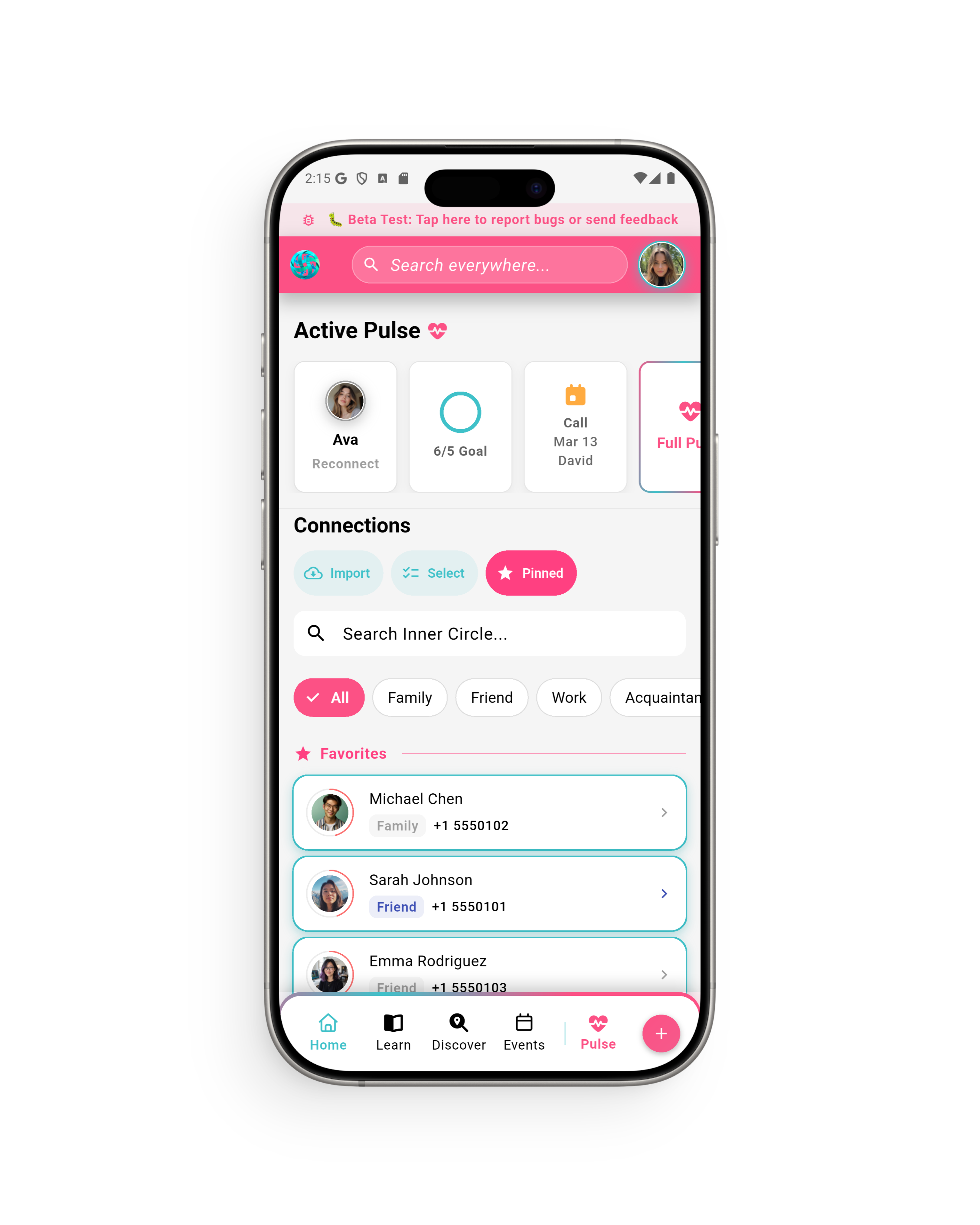Your daily rhythm for connection. See who might be quietly fading, upcoming life events, and gentle ideas for reaching out today.